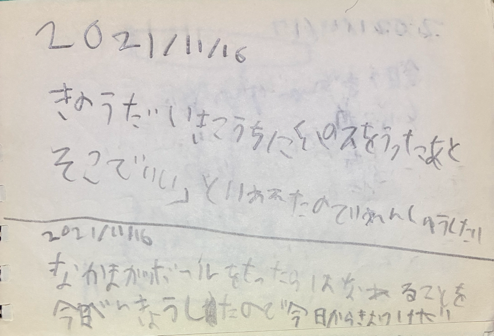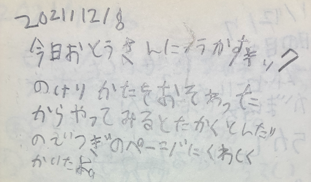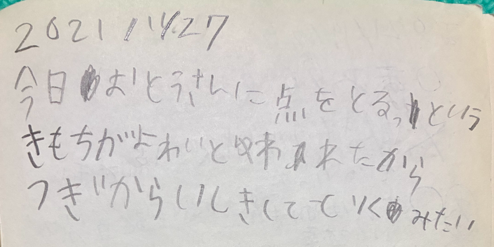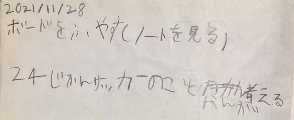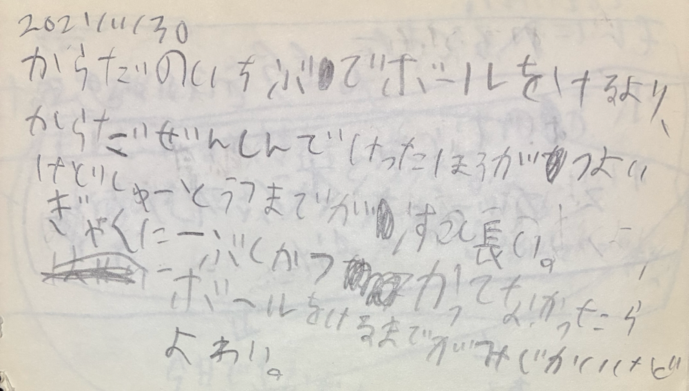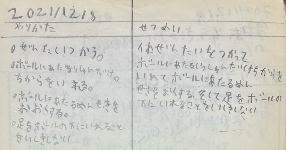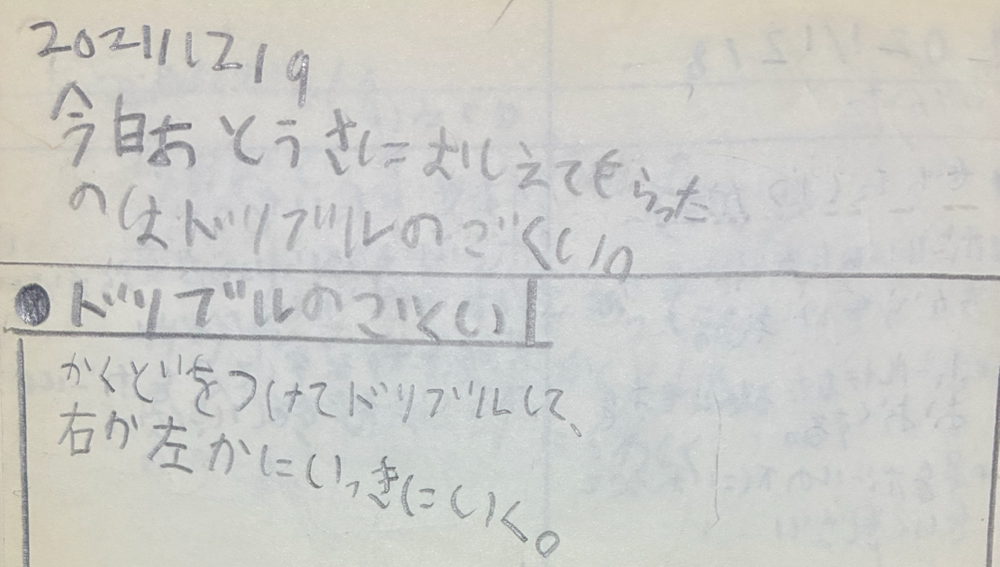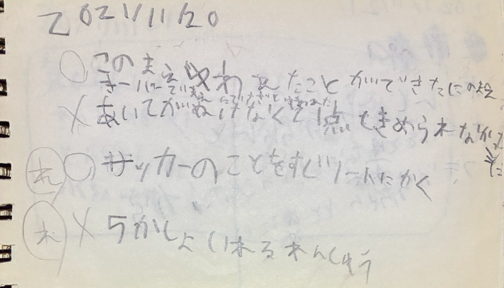 今日リフティングの練習をして、お父さんに「おちつけ」と言われておちつくと、良い記録ができたので、今日おちつくことの大事さをもっと知った。