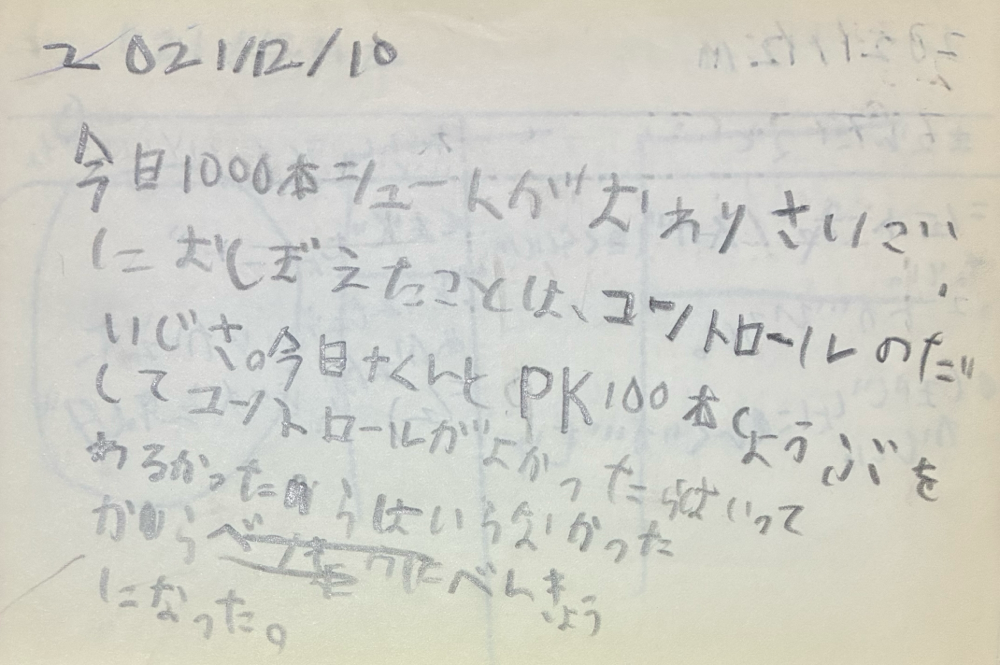 今日1000本シュートが終わり、最後に覚えたことはコントロールの大事さ。今日T君とPK100本勝負をしてコントロールが良かったら入って、悪かったら入らなかったから、勉強になった。